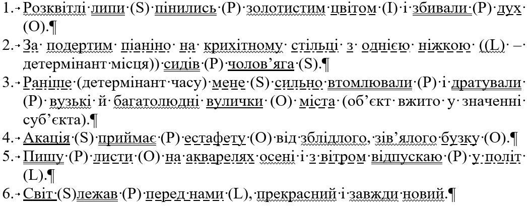 1. Відчувши дошкульний холод, я всім тілом горнувся до батька (І. Чендей). 2. Наперекір хвороби П. Амбросій переймається і громадськими справами (Б. Мельничук). 3. Старенька бабуся бреде полоти город (В. Бабляк). 4. Пташка-невільниця б’ється об невблаганні ґрати (Б. Грінченко). 5. Всюди майоріли квіти, вкриваючи землю килимом (В. Мельник). 6. Старий Хома, власник ювелірної майстерні, не міг заснути (Р. Іваничук). 7. На камінні кілька хлопів черепками грає (С. Руданський). 8. Хто може любити дитину непослушну? (Ю. Федькович). 9. Удар сокири оживив цілий ліс (О. Кобилянська). 10. Артемія бігла на сторожову вежу, сподіваючись побачити Мирона (М. Івасюк).